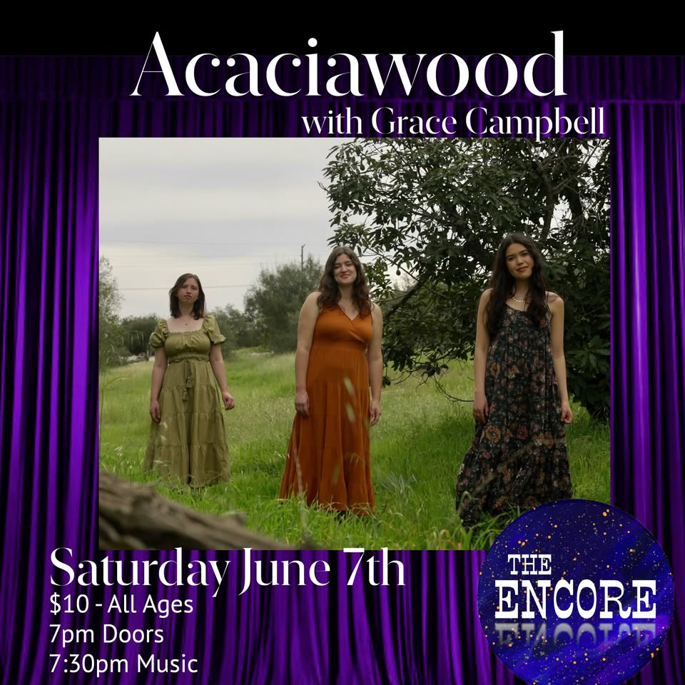 Acaciawood is a California-born, Ohio-formed folk trio blending breezy Laurel Canyon influences with the deep roots of Appalachia. Known for dynamic songwriting, powerful harmonies, and haunting violin, they first captured hearts with their single Bend the Roses and have since recorded their self-titled debut album, released April 12, 2024.