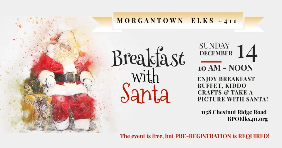 Kick off the holiday season with a magical morning at the Morgantown Elks Lodge! Families are invited to join us for a festive Breakfast with Santa, complete with a delicious breakfast buffet, kid-friendly crafts, and plenty of Christmas cheer.