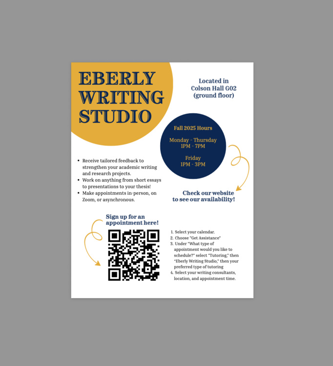 The Eberly Writing Studio is open for tutoring beginning Wednesday, August 27. Our trained writing consultants are ready to support you with any writing assignment, from drafting to revising and editing. Tutoring is free of charge and available both in-person and online.