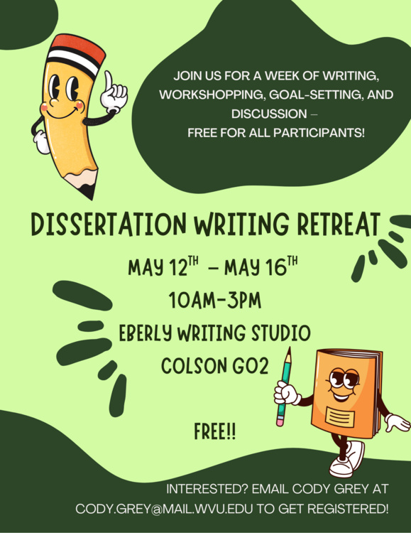 The Eberly Writing Studio is hosting its annual Dissertation Writing Retreat from May 12-16th, 2025! Registration and participation is free. Email Cody Grey at cody.grey@mail.wvu.edu to register.