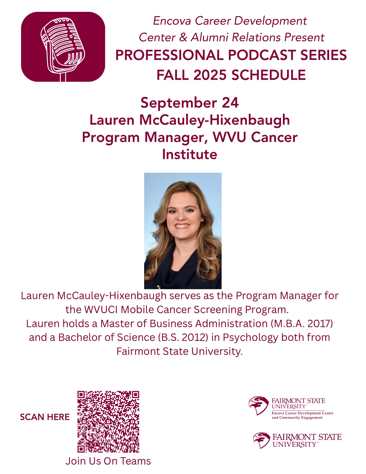 Join us on September 24 at 12:30pm for our bi-weekly “Falcons Beyond the Classroom” Podcast Series! For our next podcast, we will be speaking with Lauren McCauley-Hixembaugh!