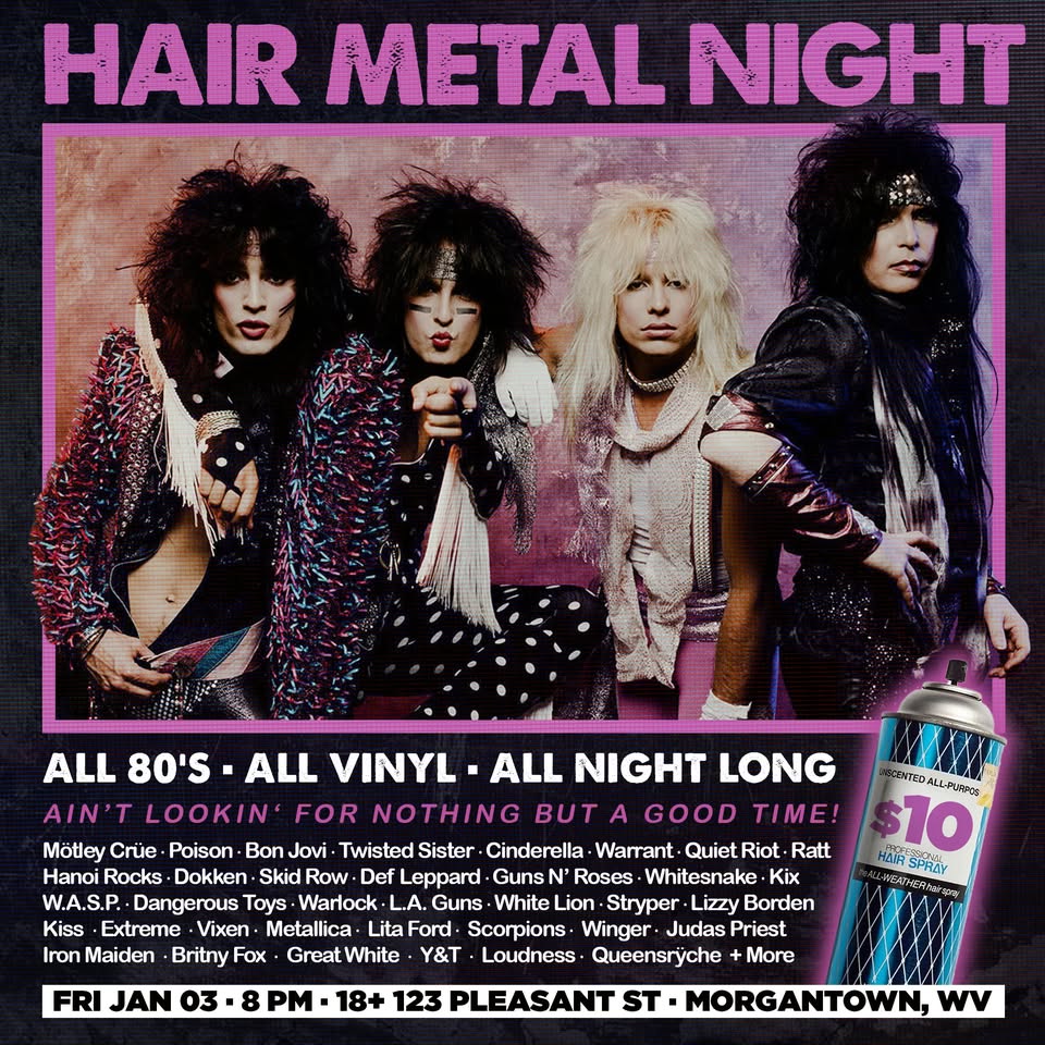 DJ Night featuring music from: Mötley Crüe · Poison · Bon Jovi · Twisted Sister · Cinderella · Warrant · Quiet Riot · Ratt · Hanoi Rocks · Dokken · Skid Row · Def Leppard · Guns N’ Roses · Whitesnake · Kix · W.A.S.P. · Dangerous Toys · Warlock · L.A. Guns · White Lion · Stryper · Lizzy Borden · Kiss · Extreme · Vixen · Metallica · Lita Ford · Scorpions · Winger · Judas Priest · Iron Maiden · Britny Fox · Great White · Y&T · Loudness · Queensrÿche + More
