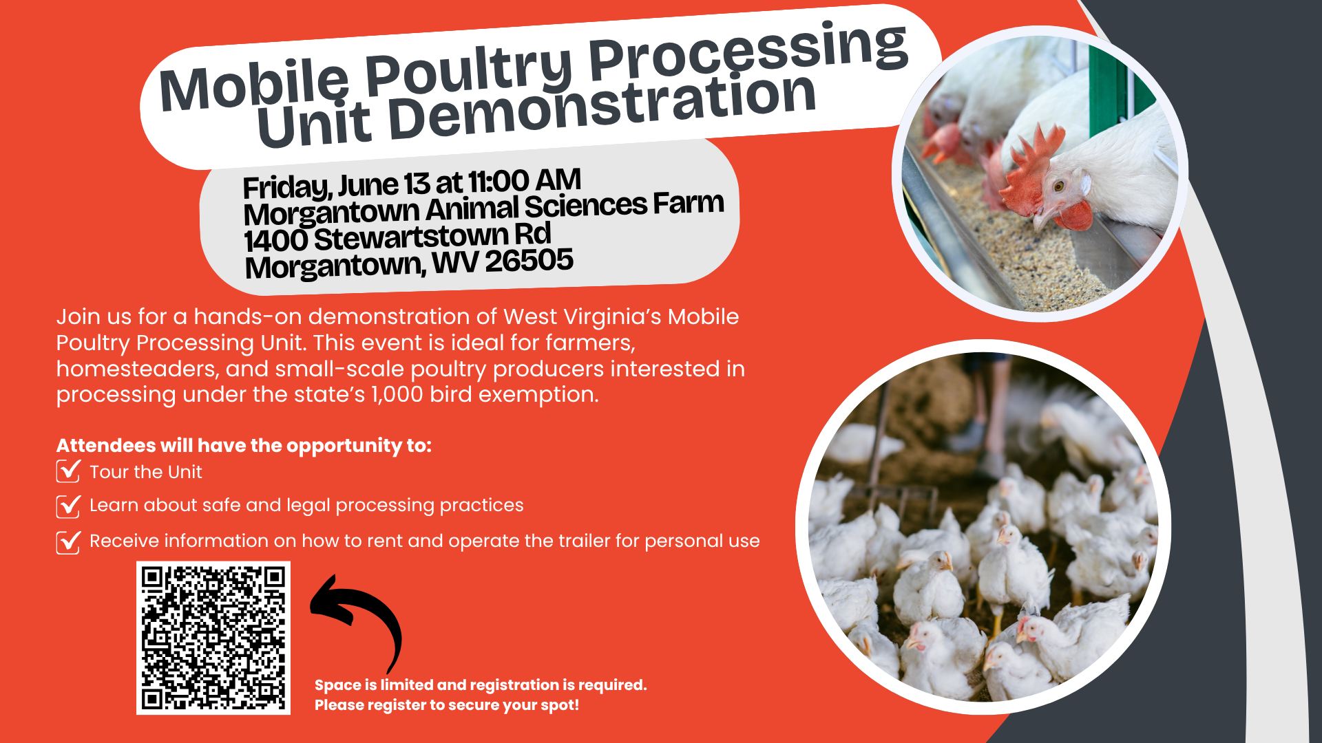 Join us Friday, June 13 at 11:00 AM at the Morgantown Animal Sciences Farm for a hands-on demonstration of the West Virginia Mobile Poultry Processing Unit!