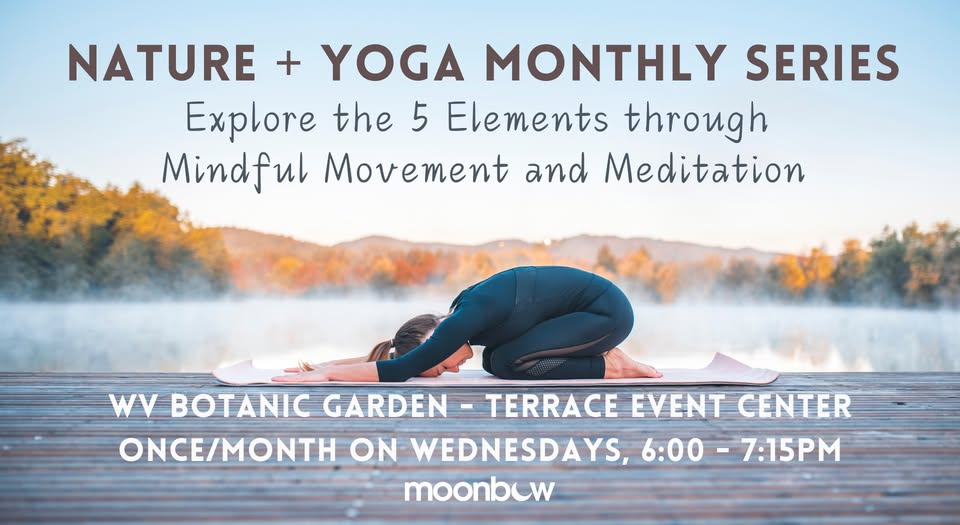 In the Nature + Yoga Series a single element will take the spotlight each month. Heidi Sherwin (E-RYT 500) will guide you through thematic postures, breathing practices, and meditation techniques so you may discover how the elements resonate with you physically, emotionally, and mentally. The accessible and well-rounded practices can also be integrated into your daily activities as you invite moments of reverence and connectivity to the rhythm of nature within and around you. The WV Botanic Garden offers an inspiring, natural habitat to explore the primal qualities associated with each element.