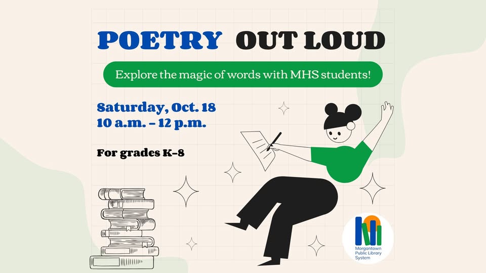 Join us for a fun and creative poetry workshop led by the Morgantown High School “Poetry Out Loud” Club! Kids in grades K–8 will get the chance to explore the magic of words through reading, writing, and hands-on activities. We’ll enjoy listening to and reading poetry, try our hand at writing our own verses, and create unique blackout poetry art. At the end, we’ll share the poetry we have created with each other. Whether you’re brand new to poetry or already love it, this workshop is a great way to express yourself and discover the joy of poetry.