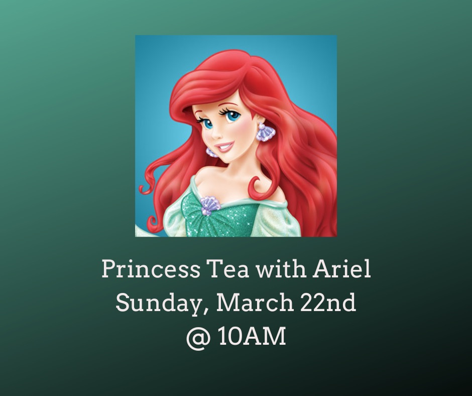 Ariel is coming to tea! Come dressed as your favorite princess and join Ariel for Tea! She will lead you in activities and crafts. Lunch will be provided. A backdrop will be set up so you can get your picture taken with one of our favorite princesses. This is a tea party you don’t want to miss. Make your reservations today! (Children’s Tea Party, suitable for ages 3 and up.). Children’s events last approximately 1 hour.