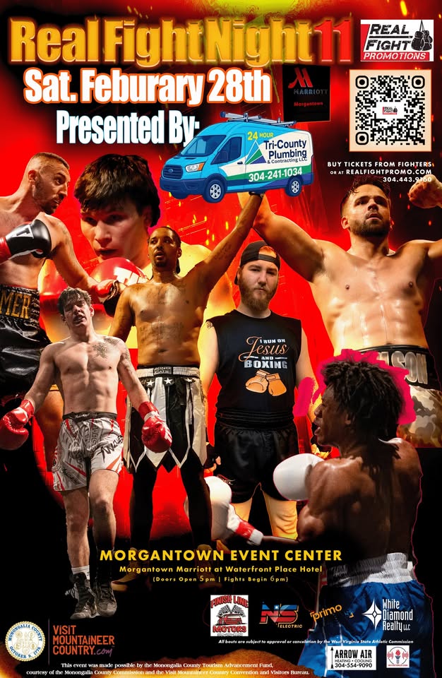 #RealFightPromo #MorgantownEvents #RealFight #boxing #MMA #morgantownWV #WVBoxing #WVU #FightNight11 #PreSuperBowl #TriCountyPlumbing #Feb7th #ActionPacked