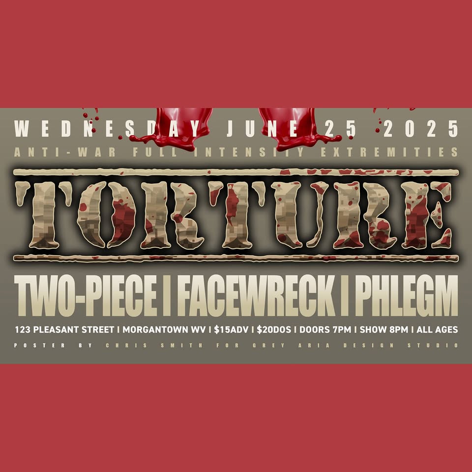 June 25th, Chicago’s TORTURE bring their anti-war intense slam to Morgantown alongside Florida’s TWO-PIECE, Pittsburgh’s FACEWRECK and Morgantown’s PHLEGM