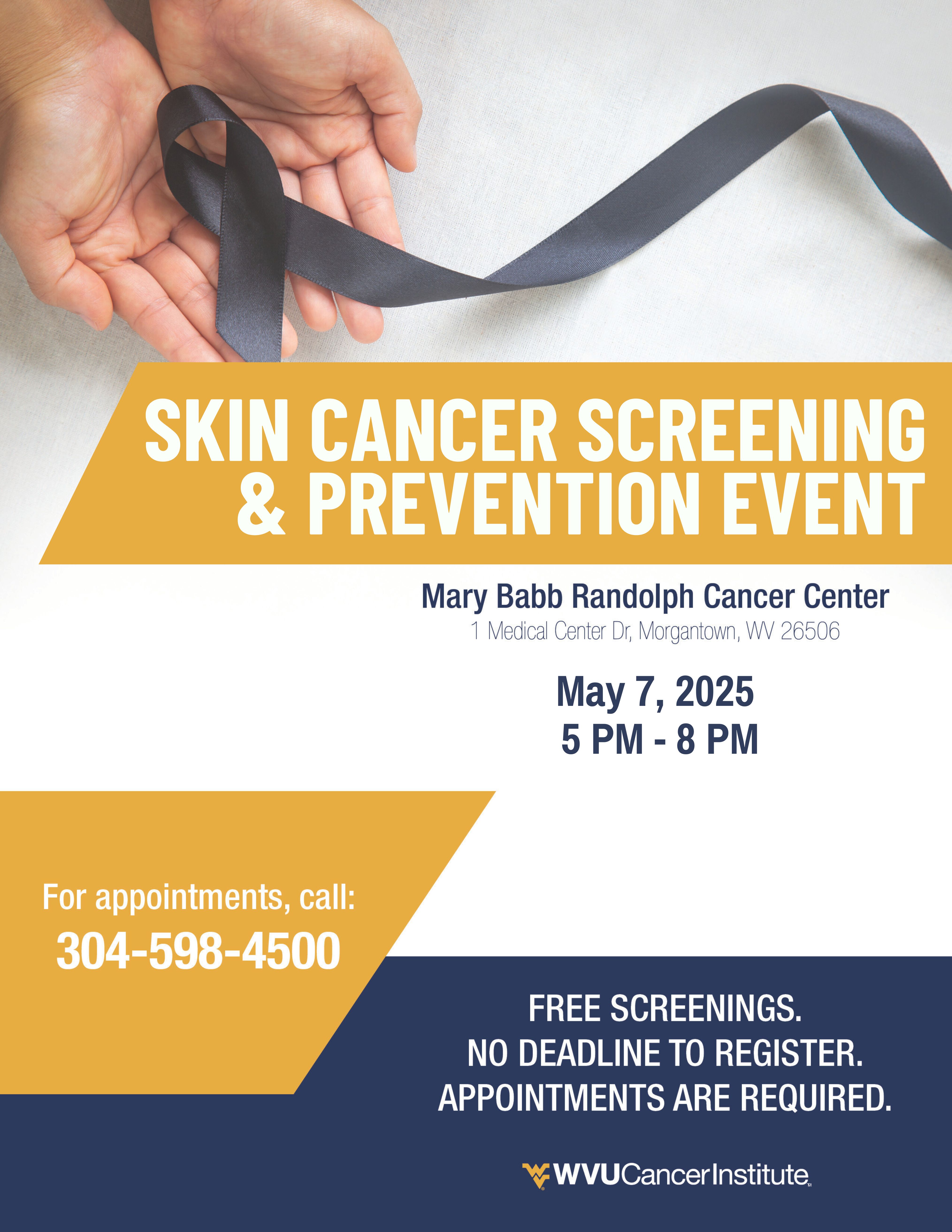 MORGANTOWN, W.Va. – The WVU Cancer Institute Mary Babb Randolph Cancer Center will offer a free skin cancer screening and prevention event from 5-8 p.m. on Wednesday, May 7.