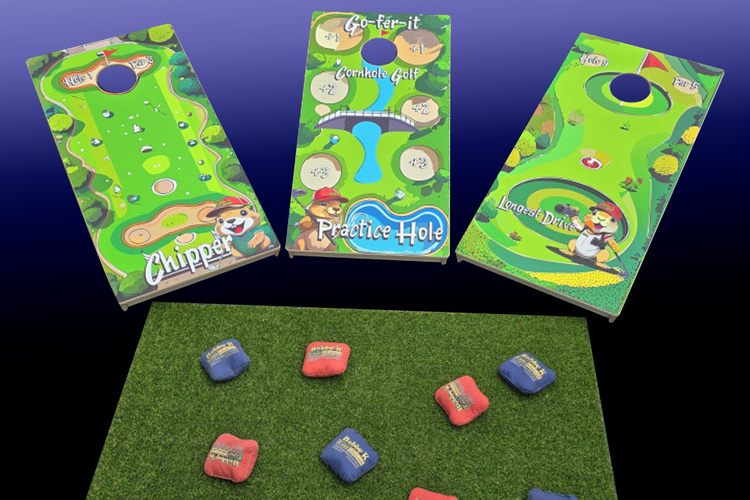 It’s a mashup of mini golf & corn hold. Play on 9 unique holes with different obstacles and challenges!